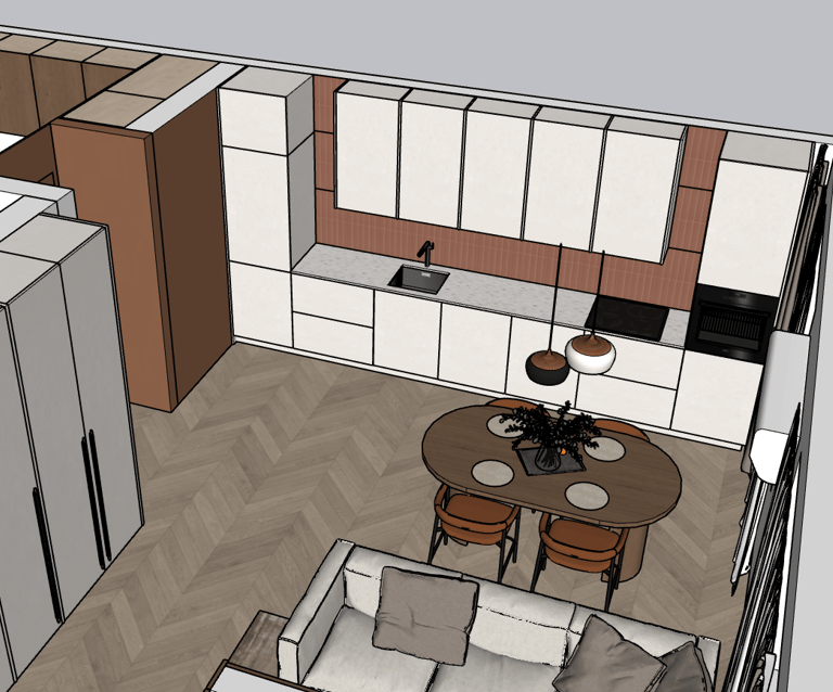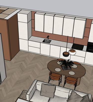 Po 3D projektavimo atvykstame į Jūsų namus – kartu išsirenkame fasadų medžiagas, tinkamiausią stalviršį ir aptariame visus svarbius niuansus: stalčių kiekį, buitinės technikos vietas bei kitas detales.